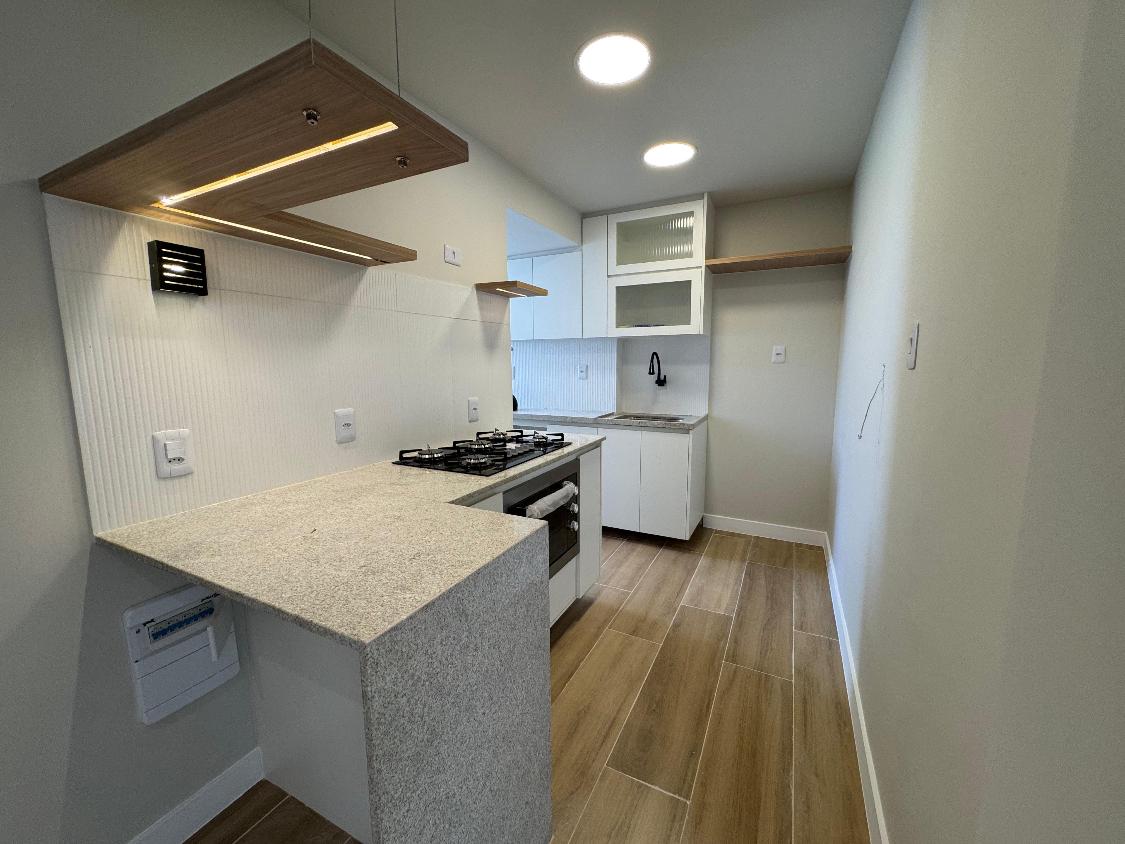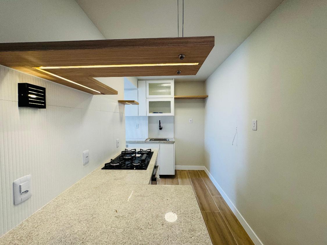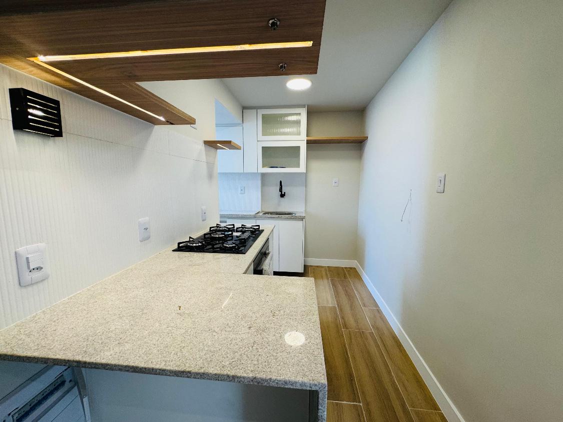São 2 quartos (sendo 1 suíte), banheiro social, uma sala confortável com vista livre, cozinha planejada e banheiros com móveis sob medida.