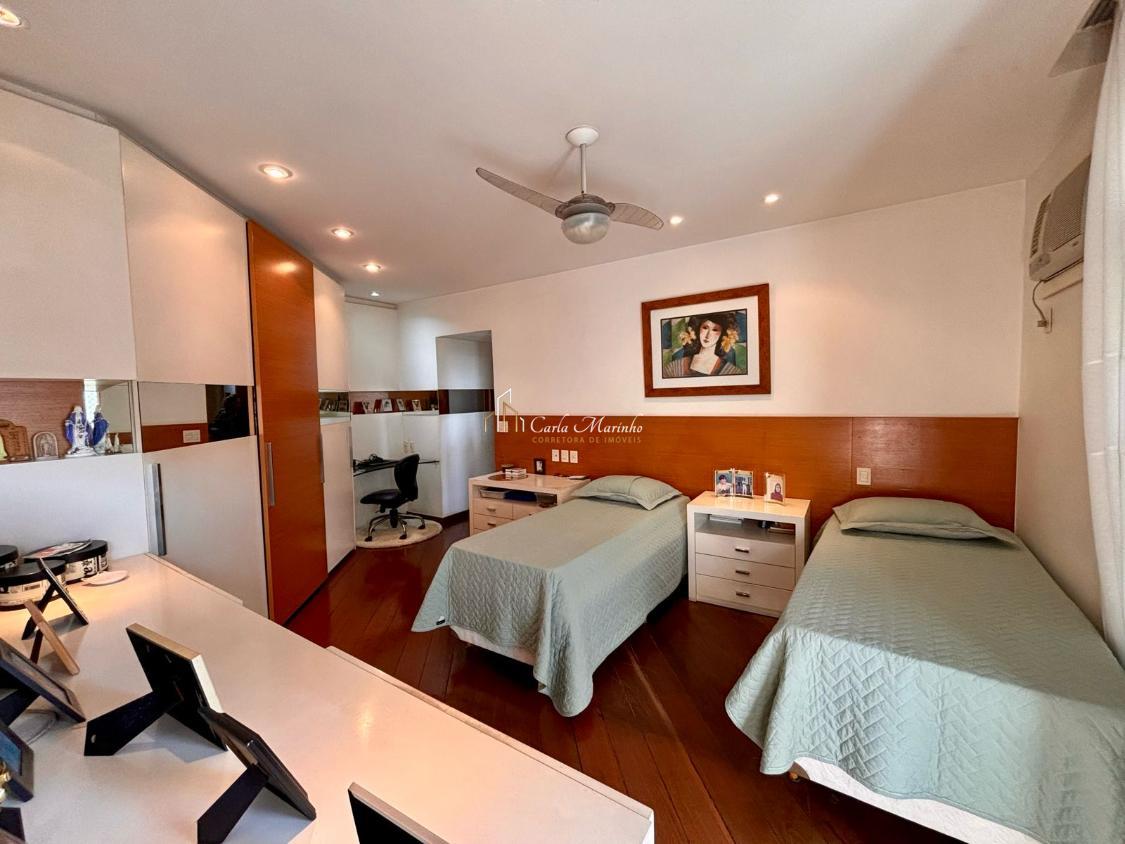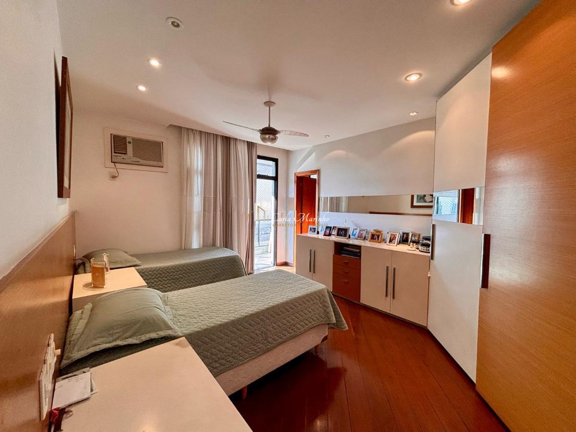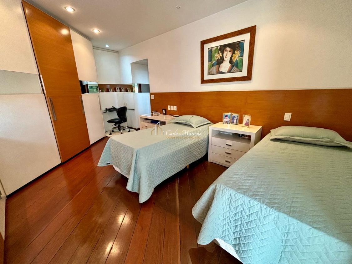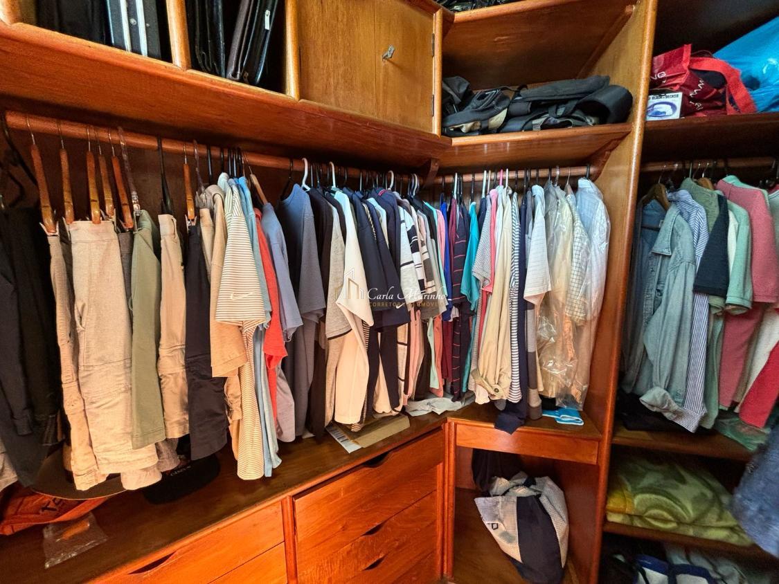 A suíte de casal com closet, armários e varanda, e a outra suítes com armário, varanda, sapateira e estante de estudos.